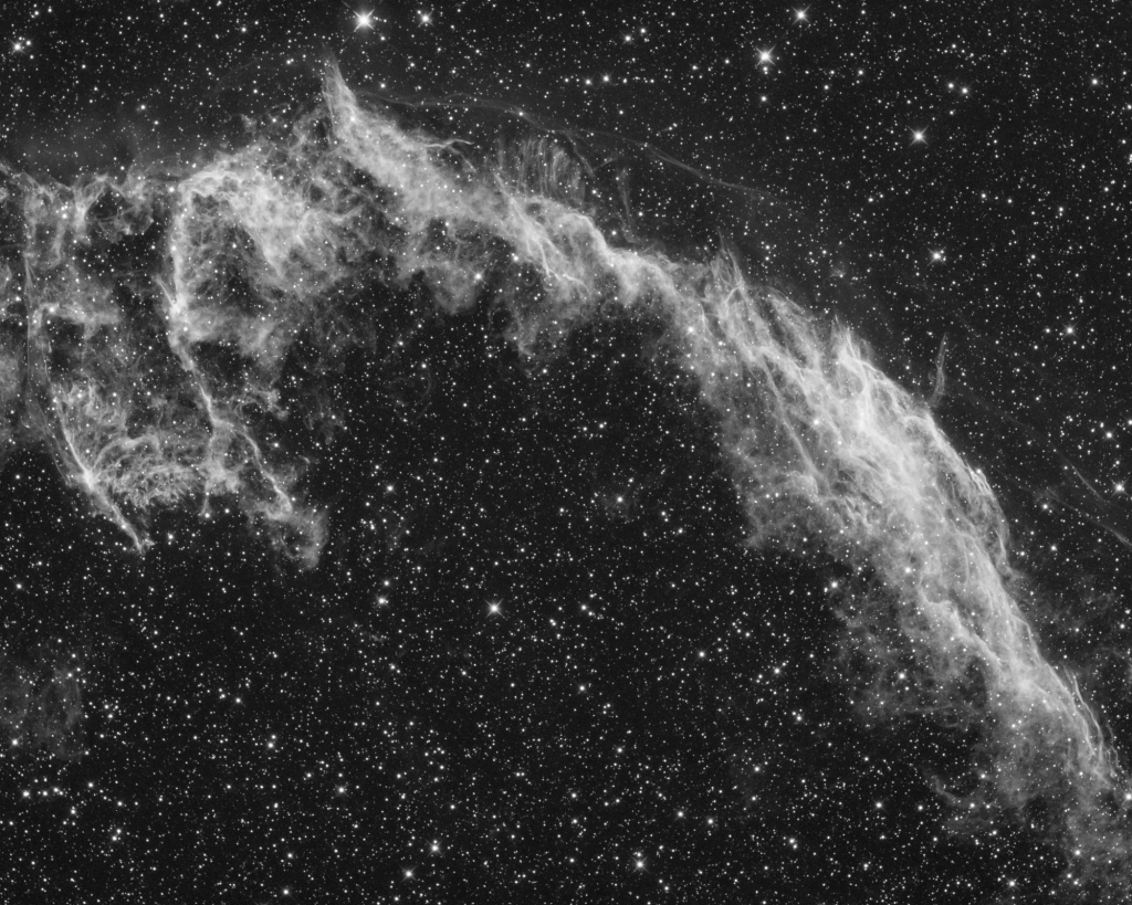 Delicate in appearance, these filaments of shocked, glowing gas, draped in planet Earth's sky toward the constellation of Cygnus, make up the eastern part of the Veil Nebula.